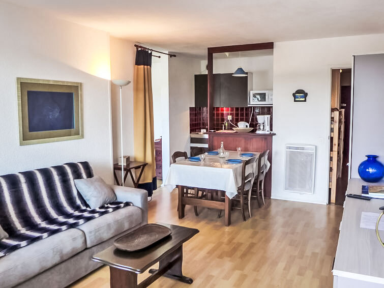 Appartement 2-kamers 40 m2 op de 3e verdieping. Woonkamer met eettafel en Flatscreen TV. Uitgang naar het terras. 1 kamer met 1 2-pers bed (140 cm, lengte 190 cm). Hal met 1 x 2 stapelbedden (80 cm, lengte 190 cm). Kookhoek (2-pits kookplaat, broodrooster, magnetron). Badkamer, aparte WC. Elektrische verwarming. Terrasmeubelen. Uitzicht op de haven. Ter beschikking: wasmachine. Internet (Internet (WiFi), extra). Parkeerplaats. Maximaal 1 huisdier/hond toegestaan. Rookmelders. 400650000516P